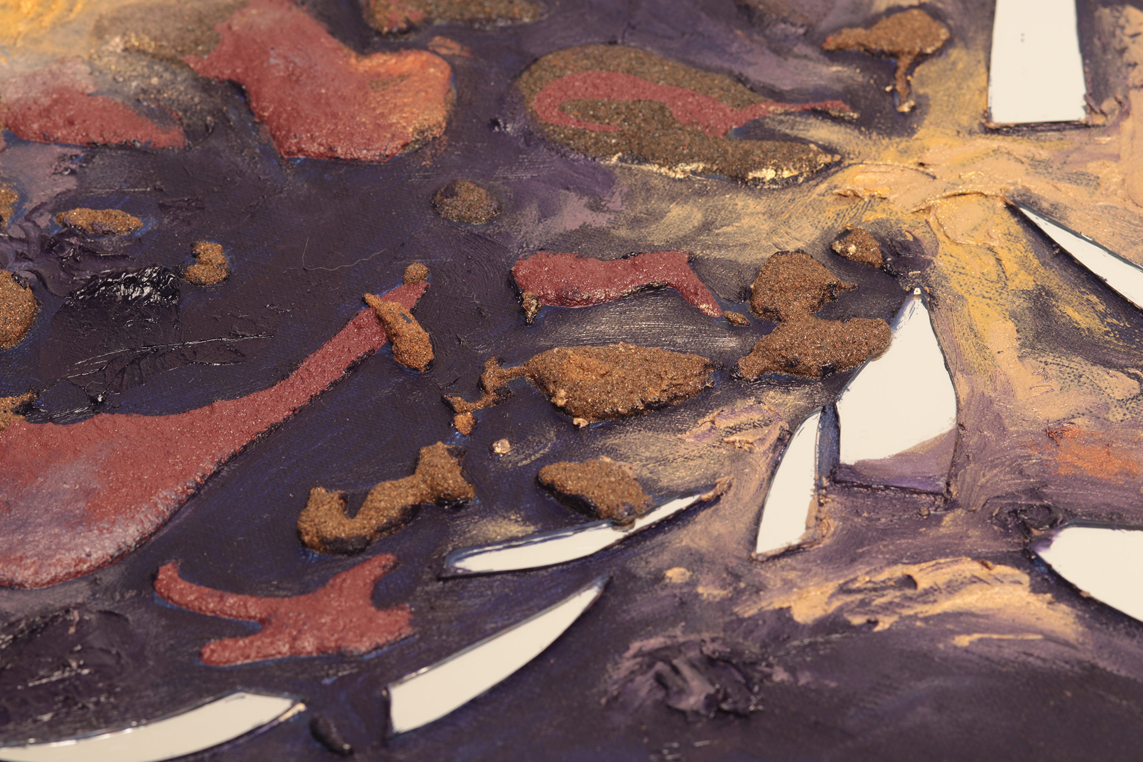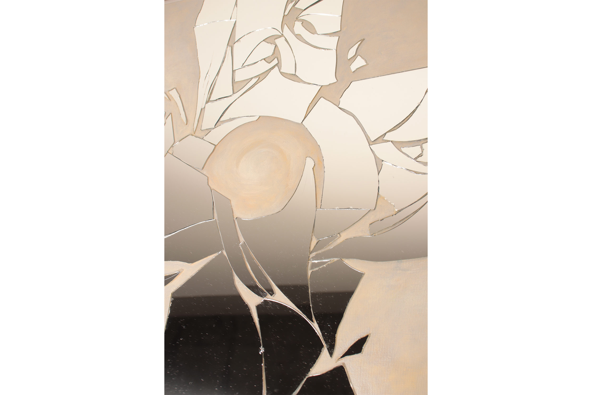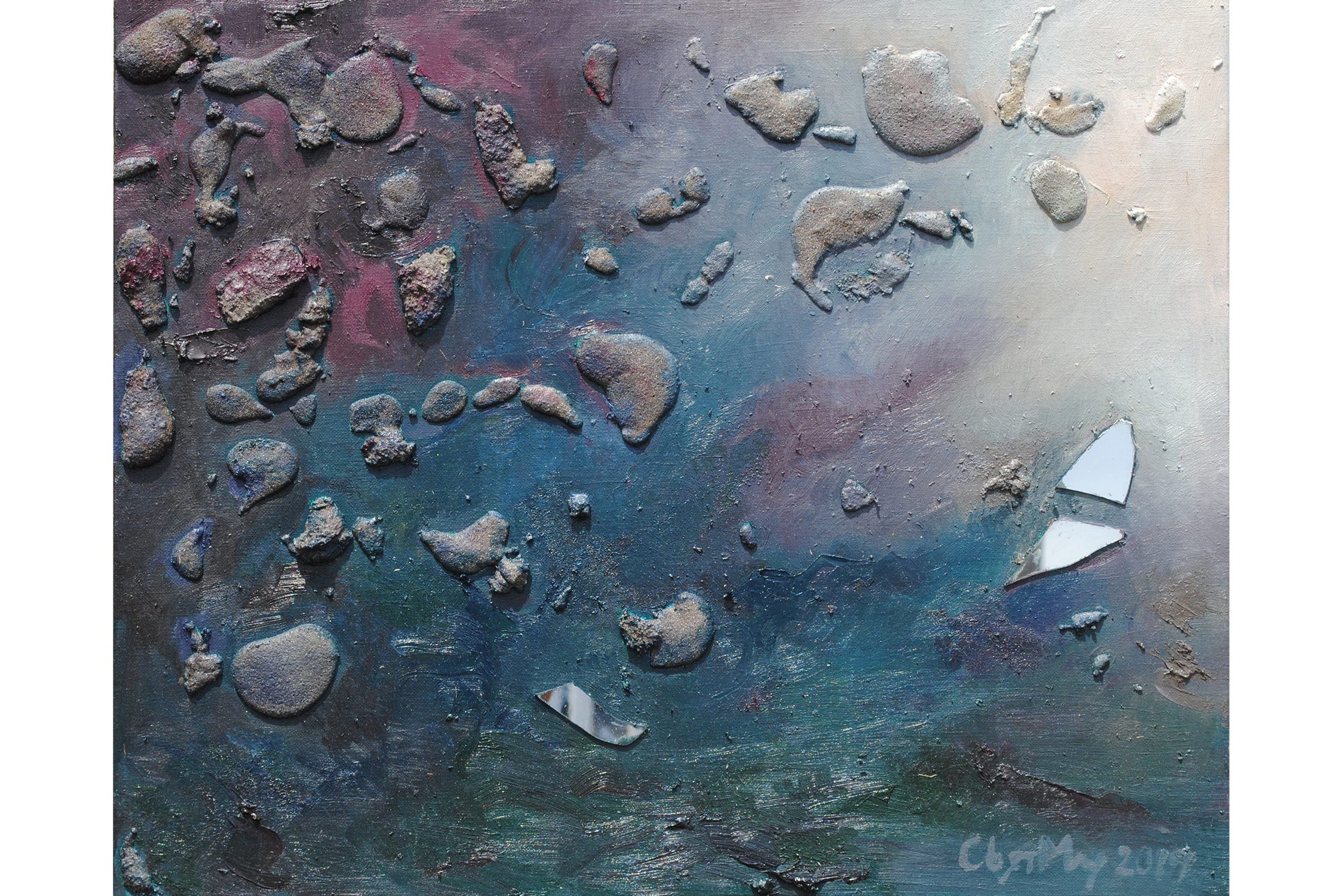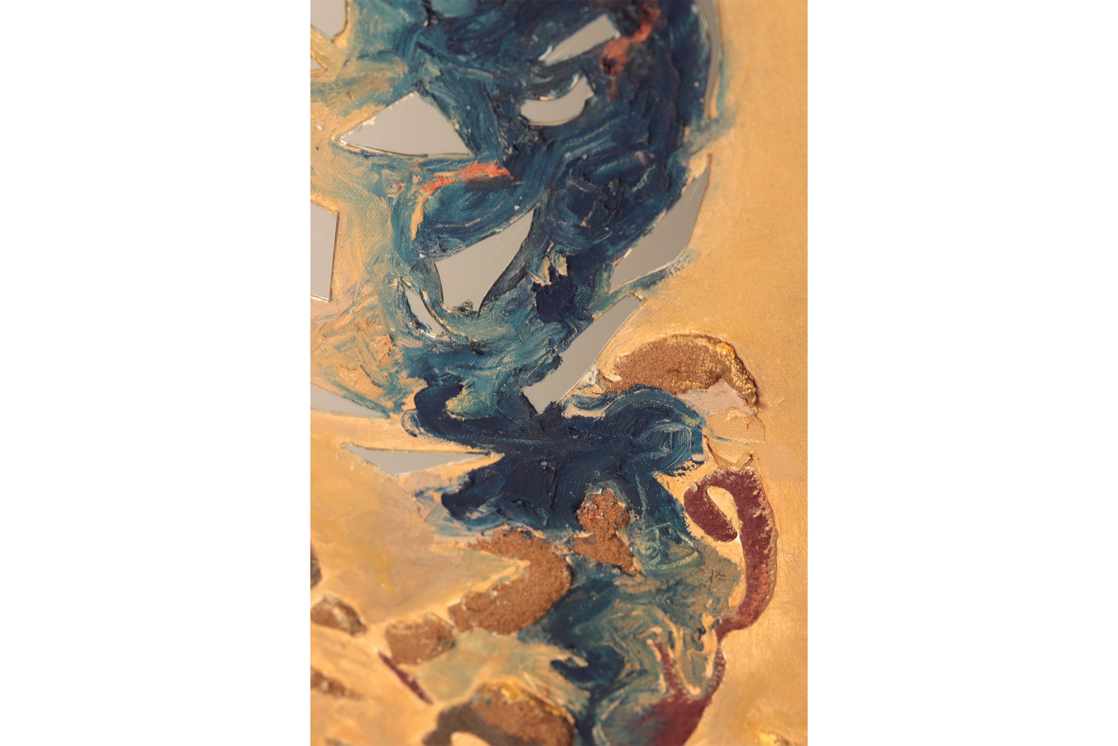 SVET MILU searches for a new language of painting by going deep down to the linkages of the material and spiritual worlds that helps reflect upon our real selves. Through oil colours, sand and mirror, her work frames the visions of pre-matter and inevitably ask the observers – caught by the mirror – to intimately reflect upon themselves and their fragmented ideas and lives. This is an attempt to transform the field of painting canvas into a spiritual essence – by reaching the depth at molecular level where the two worlds interact and by creating a genuine relief sign that will, being freed form the pressure of object, behave as an autochtonous being and not only as a representation of the observed and experienced. This lyrical-philosophical abstraction is the lens of convergence points between the material and spiritual worlds, as well as the presentation of their dualism and continuing struggle. Drops of sand, which is unstable and organic material, symbolize the visible material life, the body, as well as the instability of external world and a constant change as its imminent characteristic. Pieces of mirror present the soul and our spiritual life with all its fragments, phases, and processes.