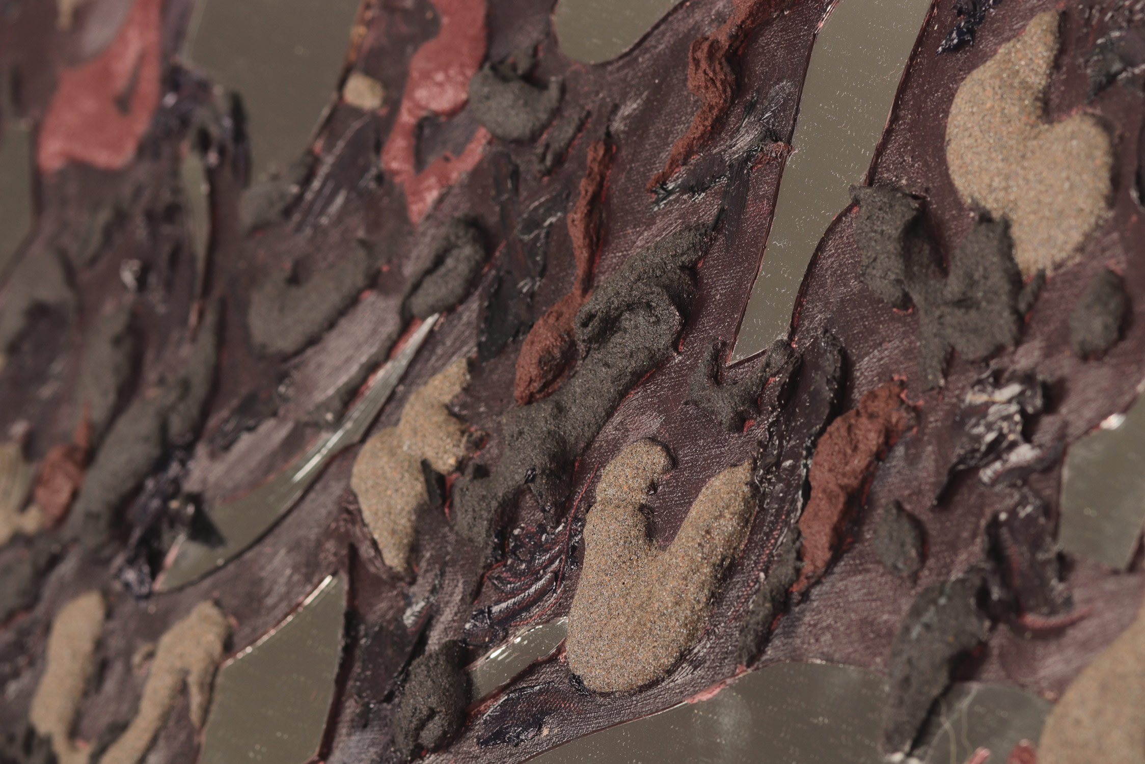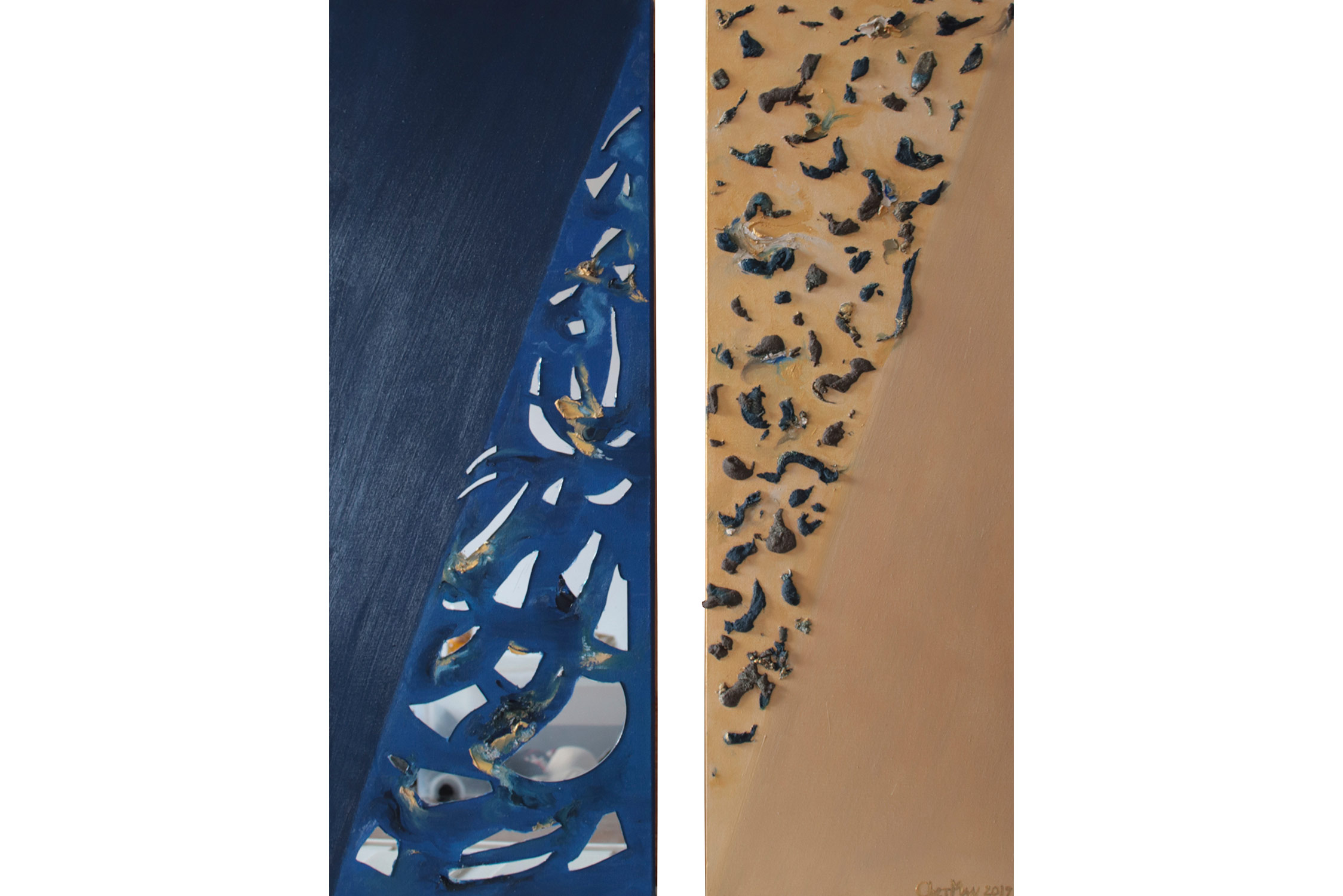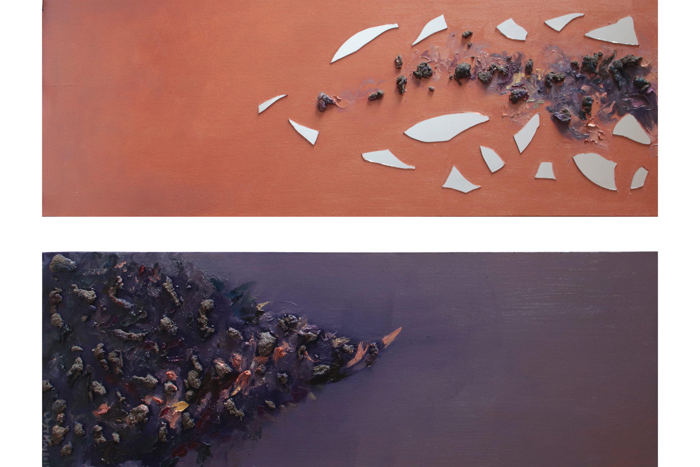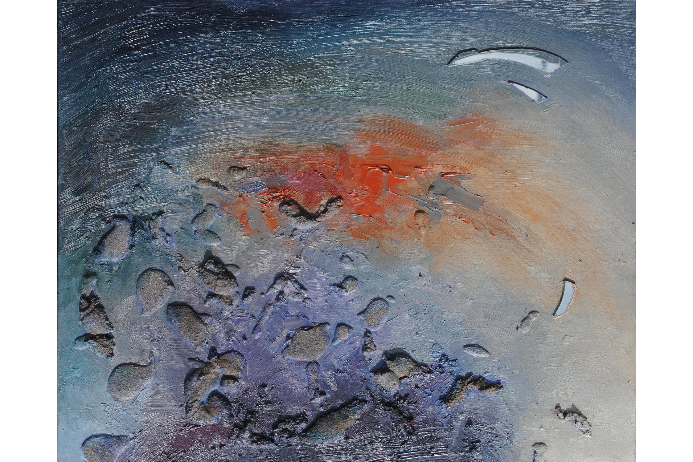SVET MILU searches for a new language of painting by going deep down to the linkages of the material and spiritual worlds that helps reflect upon our real selves. Through oil colours, sand and mirror, her work frames the visions of pre-matter and inevitably ask the observers – caught by the mirror – to intimately reflect upon themselves and their fragmented ideas and lives. This is an attempt to transform the field of painting canvas into a spiritual essence – by reaching the depth at molecular level where the two worlds interact and by creating a genuine relief sign that will, being freed form the pressure of object, behave as an autochtonous being and not only as a representation of the observed and experienced. This lyrical-philosophical abstraction is the lens of convergence points between the material and spiritual worlds, as well as the presentation of their dualism and continuing struggle. Drops of sand, which is unstable and organic material, symbolize the visible material life, the body, as well as the instability of external world and a constant change as its imminent characteristic. Pieces of mirror present the soul and our spiritual life with all its fragments, phases, and processes.