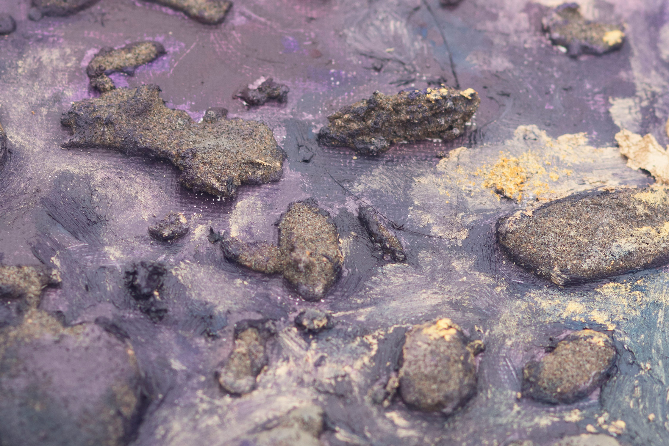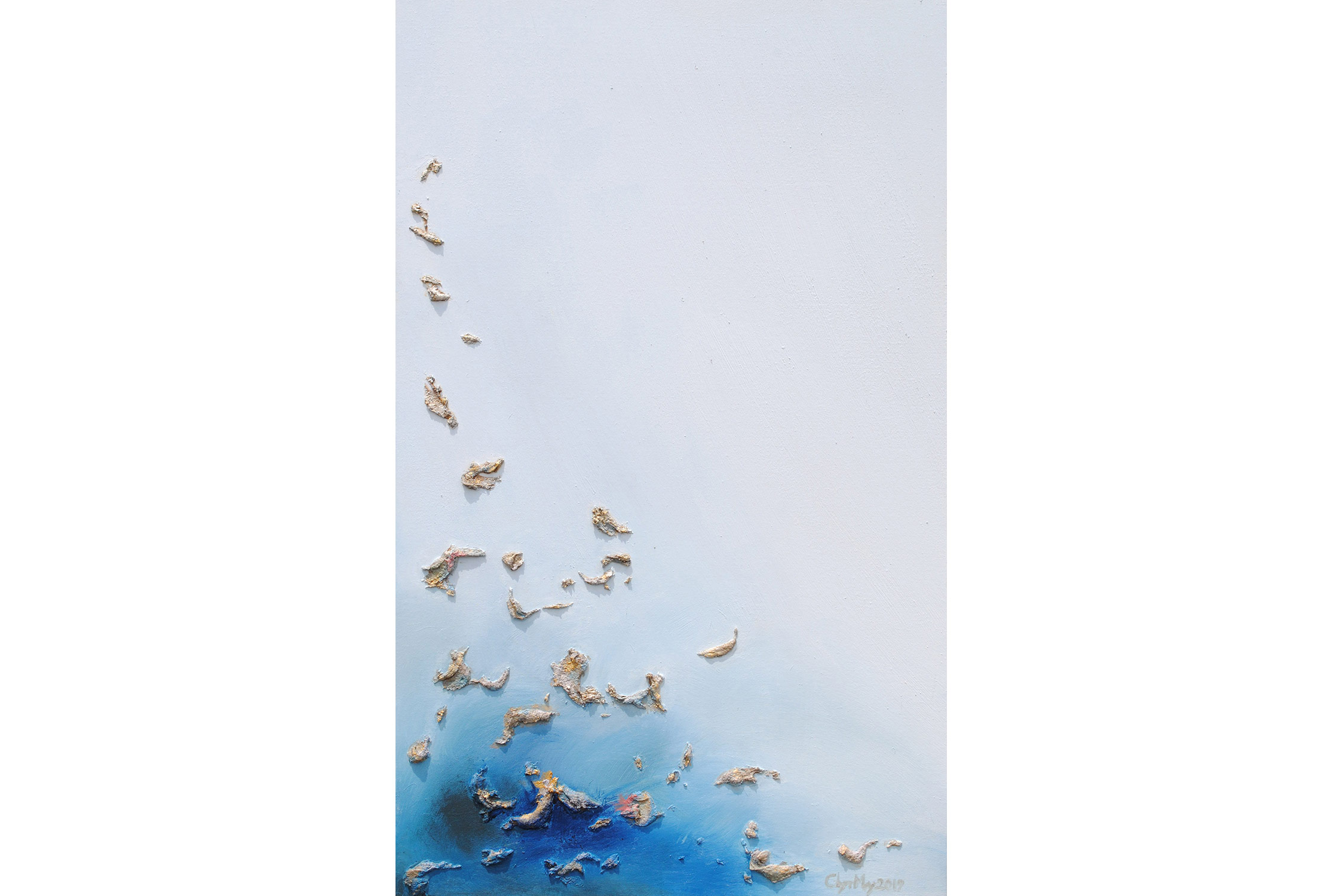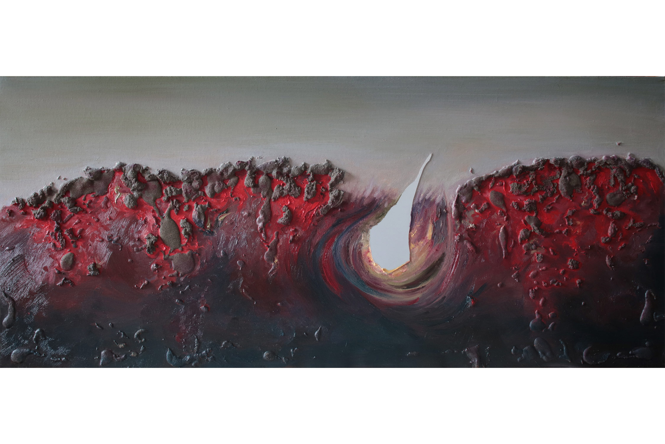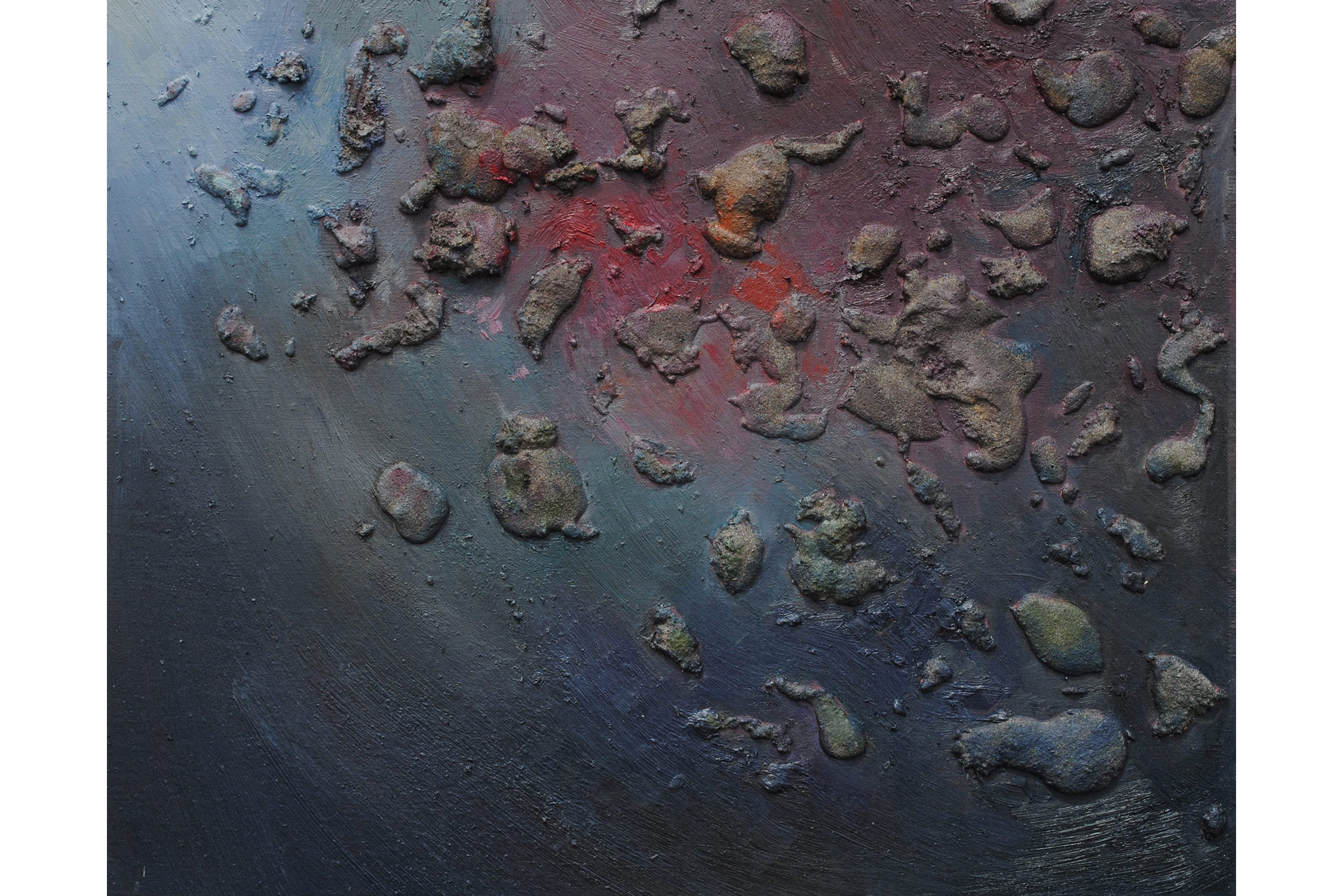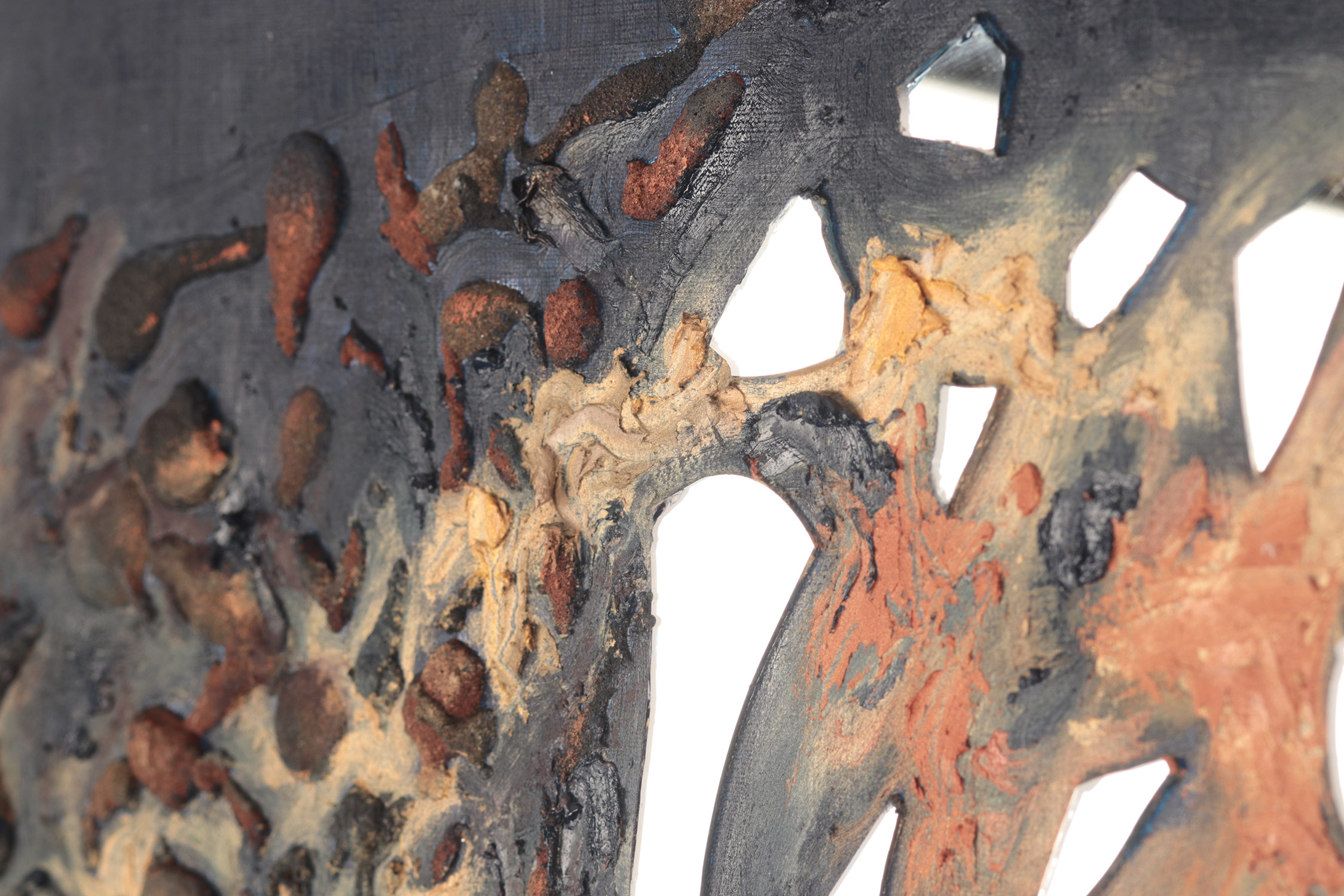 SVET MILU searches for a new language of painting by going deep down to the linkages of the material and spiritual worlds that helps reflect upon our real selves. Through oil colours, sand and mirror, her work frames the visions of pre-matter and inevitably ask the observers – caught by the mirror – to intimately reflect upon themselves and their fragmented ideas and lives. This is an attempt to transform the field of painting canvas into a spiritual essence – by reaching the depth at molecular level where the two worlds interact and by creating a genuine relief sign that will, being freed form the pressure of object, behave as an autochtonous being and not only as a representation of the observed and experienced. This lyrical-philosophical abstraction is the lens of convergence points between the material and spiritual worlds, as well as the presentation of their dualism and continuing struggle. Drops of sand, which is unstable and organic material, symbolize the visible material life, the body, as well as the instability of external world and a constant change as its imminent characteristic. Pieces of mirror present the soul and our spiritual life with all its fragments, phases, and processes.