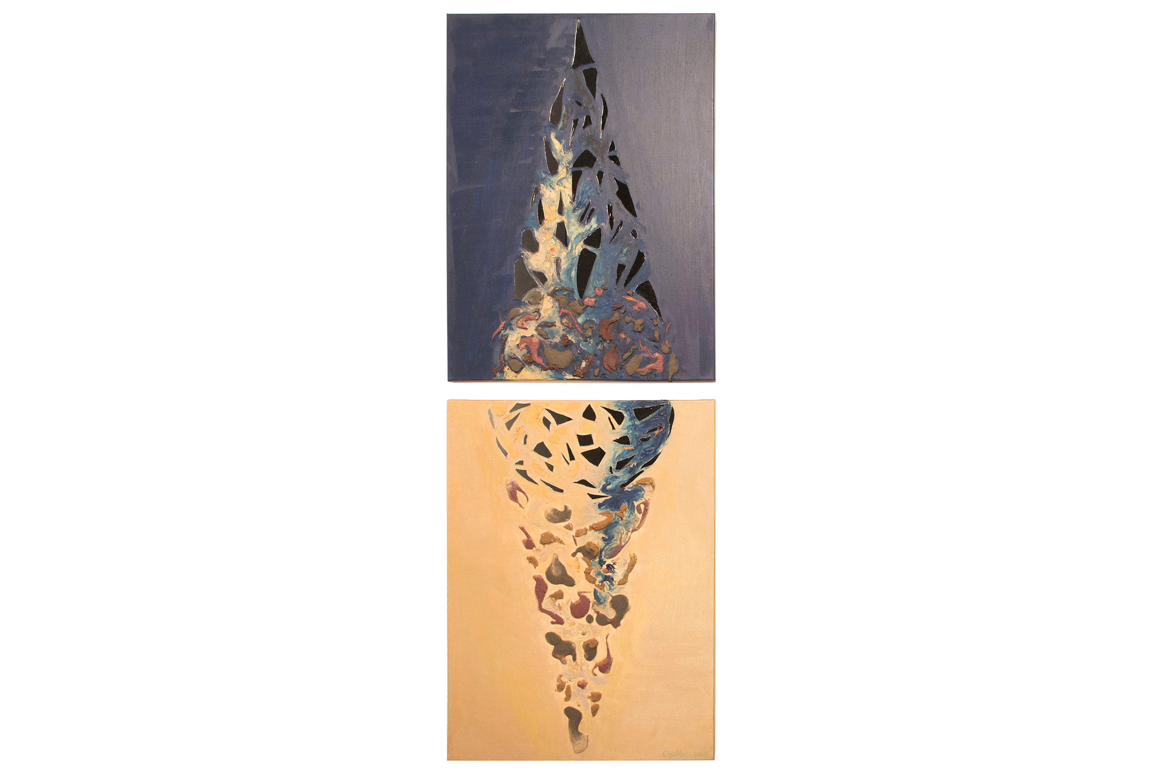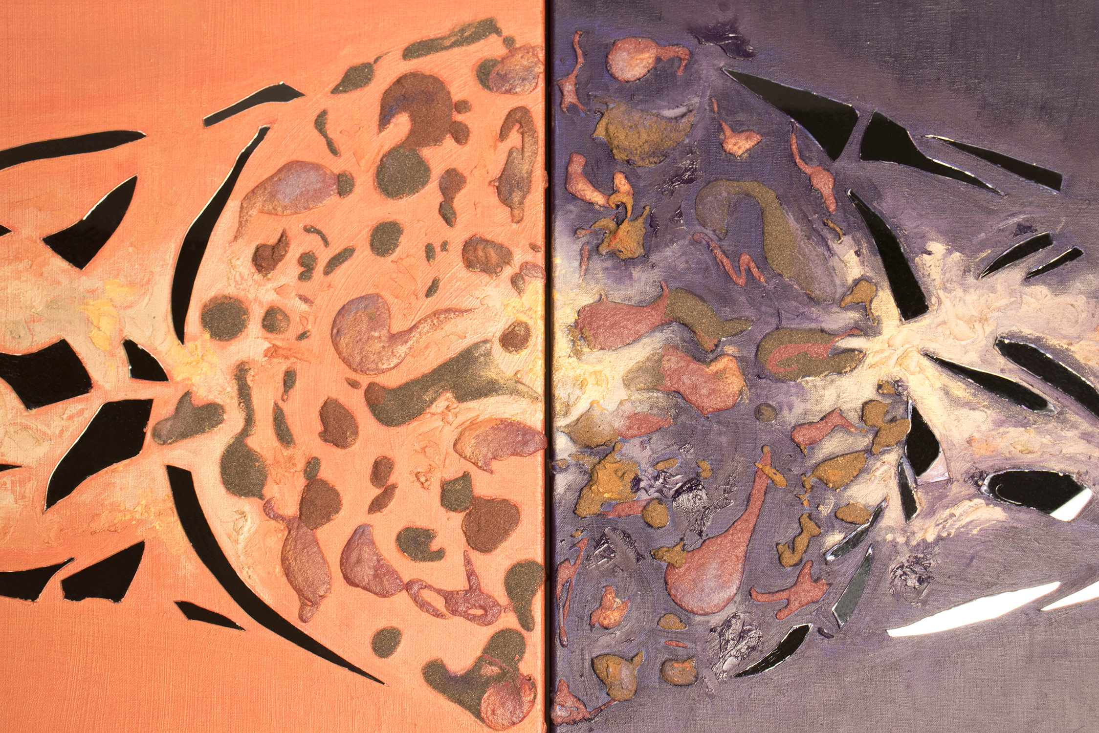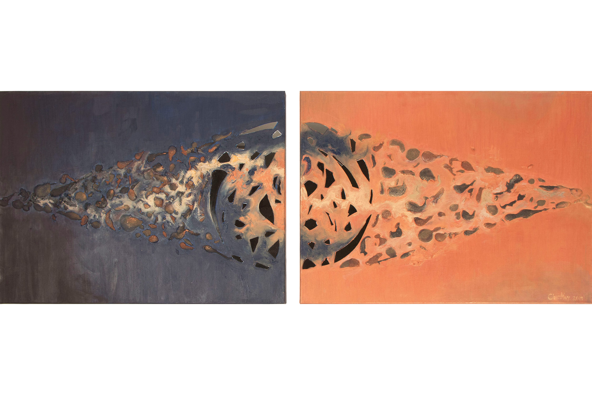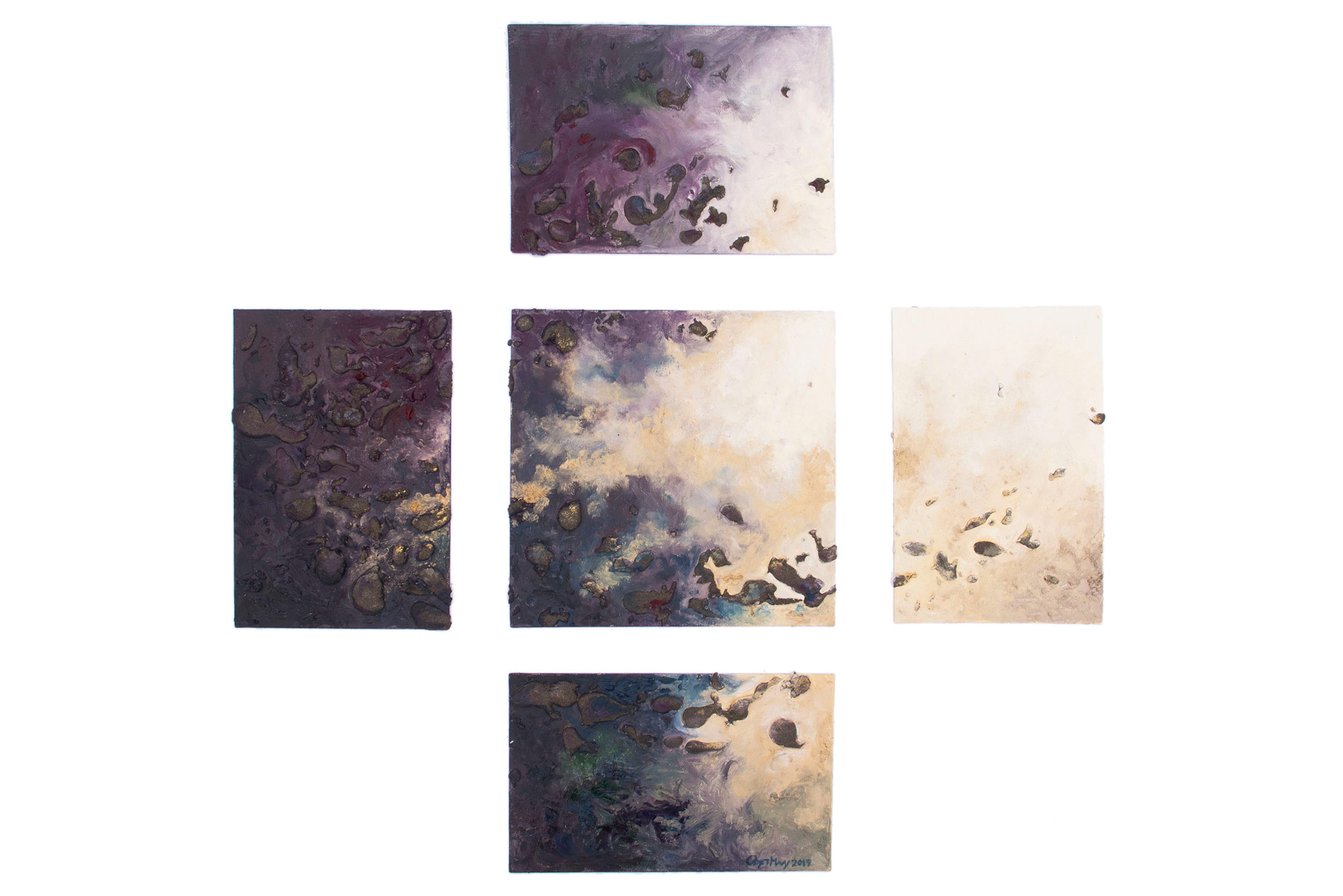 SVET MILU searches for a new language of painting by going deep down to the linkages of the material and spiritual worlds that helps reflect upon our real selves. Through oil colours, sand and mirror, her work frames the visions of pre-matter and inevitably ask the observers – caught by the mirror – to intimately reflect upon themselves and their fragmented ideas and lives. This is an attempt to transform the field of painting canvas into a spiritual essence – by reaching the depth at molecular level where the two worlds interact and by creating a genuine relief sign that will, being freed form the pressure of object, behave as an autochtonous being and not only as a representation of the observed and experienced. This lyrical-philosophical abstraction is the lens of convergence points between the material and spiritual worlds, as well as the presentation of their dualism and continuing struggle. Drops of sand, which is unstable and organic material, symbolize the visible material life, the body, as well as the instability of external world and a constant change as its imminent characteristic. Pieces of mirror present the soul and our spiritual life with all its fragments, phases, and processes.