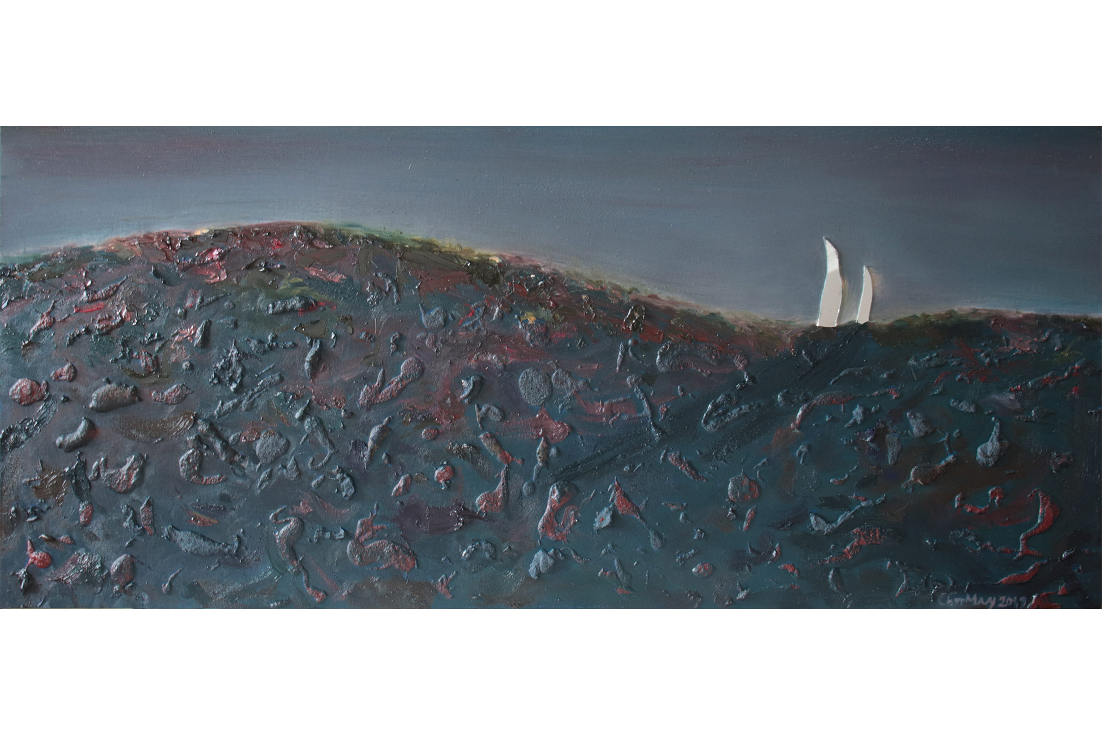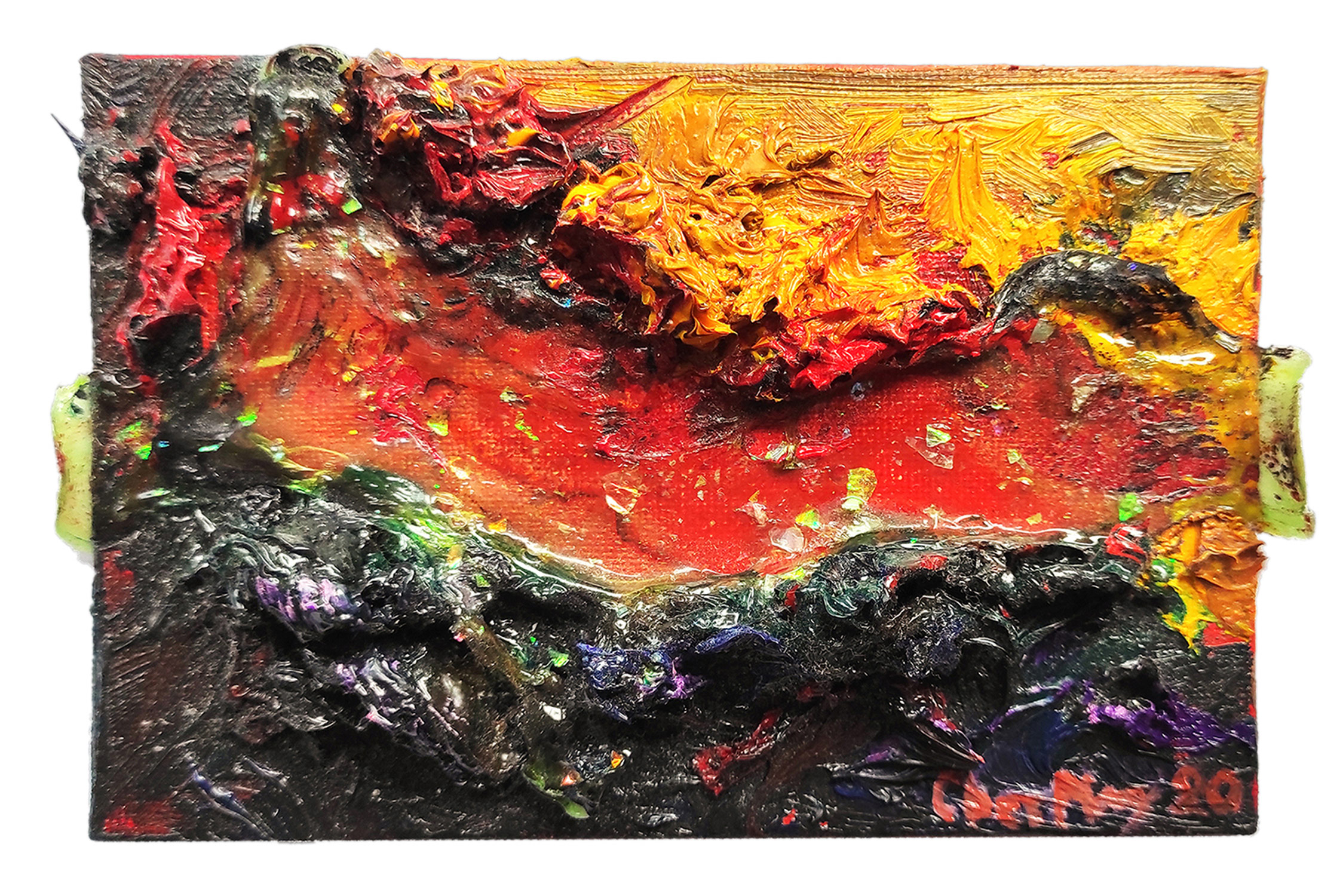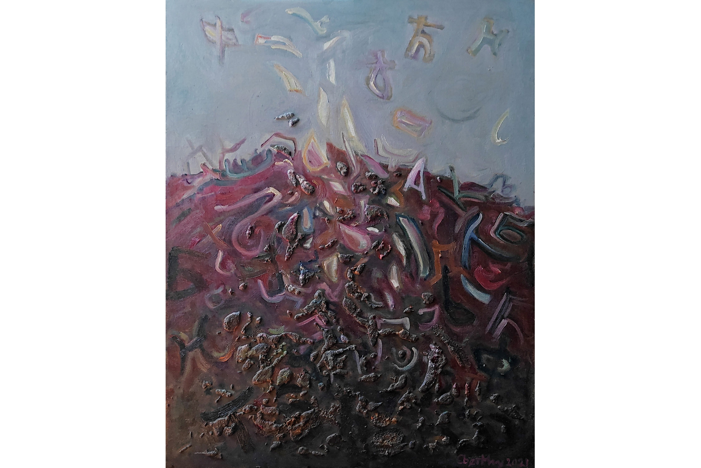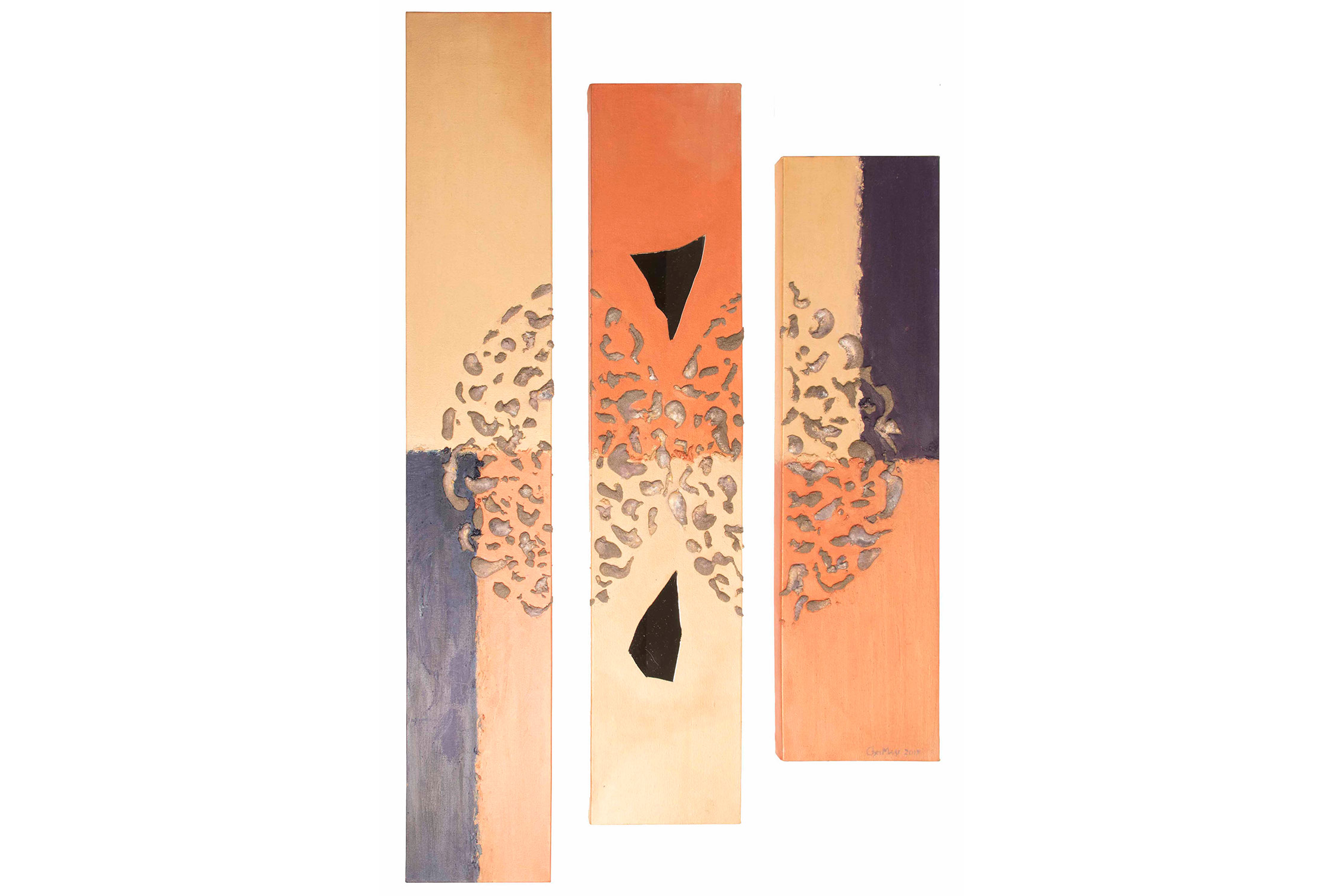 SVET MILU searches for a new language of painting by going deep down to the linkages of the material and spiritual worlds that helps reflect upon our real selves. Through oil colours, sand and mirror, her work frames the visions of pre-matter and inevitably ask the observers – caught by the mirror – to intimately reflect upon themselves and their fragmented ideas and lives. This is an attempt to transform the field of painting canvas into a spiritual essence – by reaching the depth at molecular level where the two worlds interact and by creating a genuine relief sign that will, being freed form the pressure of object, behave as an autochtonous being and not only as a representation of the observed and experienced. This lyrical-philosophical abstraction is the lens of convergence points between the material and spiritual worlds, as well as the presentation of their dualism and continuing struggle. Drops of sand, which is unstable and organic material, symbolize the visible material life, the body, as well as the instability of external world and a constant change as its imminent characteristic. Pieces of mirror present the soul and our spiritual life with all its fragments, phases, and processes.